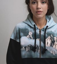 Der Print auf Soronafleece zeigt ein detailreiches Bergpanorama – kombiniert mit tiefschwarzer Bio-Baumwolle.